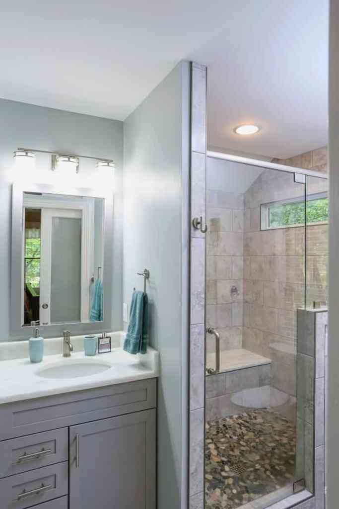 Spacious Shower – Another benefit to a bathroom is a well-designed shower. While some people prefer tubs, a shower, especially one with a seat, is more functional and accessible to a wider variety of people. For this project, we removed the outdated tub and added a luxurious shower with pebble floors. The shower has a seated area for more accessibility and a removable shower wand.