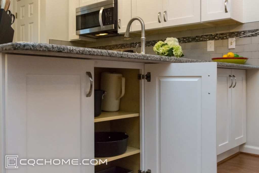 Storage Options – Another important kitchen feature that can be overlooked is storage. It won’t matter if your kitchen is stunning if you have no where to place your pots and pans. Especially in small kitchens, storage is king. We were able to add more storage to this kitchen by adding shallow depth cabinets and incorporating pull-out trays in the cabinets. We also included sponge trays by the sink for easy access and clean storage.